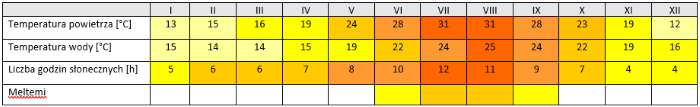 Woda w morzu w maju ma ok. 18°C i nagrzewa się przez kolejne miesiące, a najcieplejsza jest w sierpniu (25°C), po czym temperatura spada powoli, aby w listopadzie osiągnąć znowu 18°C. Morze jest chłodniejsze na zachodnich wybrzeżach wysp, przy wietrze N i NE, a cieplejsze przy wietrze S i na płyciznach.