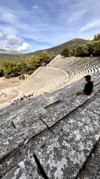 Przejazd trwał 15-20 minut. Bilety wstępu na teren amfiteatru i muzeum kosztują po 20 euro za osobę dorosłą (dzieci za darmo). Nie wszyscy byli zachwyceni, ale moim zdaniem amfiteatr w Epidauros to punkt obowiązkowy rejsów w tym rejonie. Ma ponad 2300 lat i jest jednym z najlepiej zachowanych teatrów antycznych w Grecji. Mieścił około 14 tysięcy widzów, a jego akustyka działa bezbłędnie – z najwyższych rzędów słychać nawet cichy głos i dźwięk monety upuszczonej na środku sceny.
