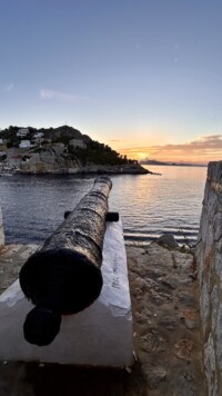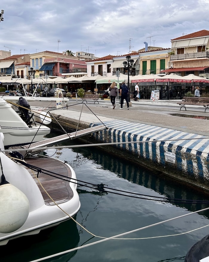 Nagrodą za manewry był wspaniały zachód słońca nad Peloponezem, który oglądaliśmy z bastionu nad portem. W miasteczku nie ma hoteli. Za to pełno jest żeglarzy, kameralnych sklepików i galerii sztuki oraz kotów – Leo naliczył ich ponad 65 w jedno popołudnie!