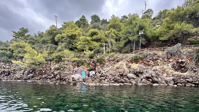 Później, płynąc już wzdłuż Methany, postanowiliśmy sprawdzić Łaźnie Pauzaniasza – to niewielka kamienna niecka na samym brzegu, zasilana wodą ze źródeł siarkowych. Woda ma specyficzny zapach i żółtawy kolor, bo wypływa spod wulkanu. Warunki były spokojne, więc nawet nie rzucaliśmy kotwicy tylko krążyliśmy na najmniejszych obrotach silnika, a tester Piotr po prostu popłynął z jachtu na ląd wpław. Nasza ocena Łaźni to 5/10. Bardzo fajna ciekawostka geologiczna, można się chwilę pomoczyć jeśli macie „po drodze”, ale trasy dla tego miejsca zmieniać nie warto.